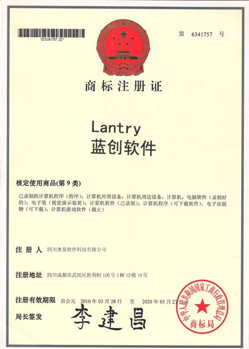 四川奥易软件科技有限公司申请蓝创LANTRY商标登记,顺利通过中华人民共和国工商行政管理总局商标局审核,正式注册成功,喜获证书。